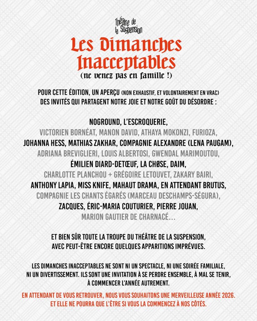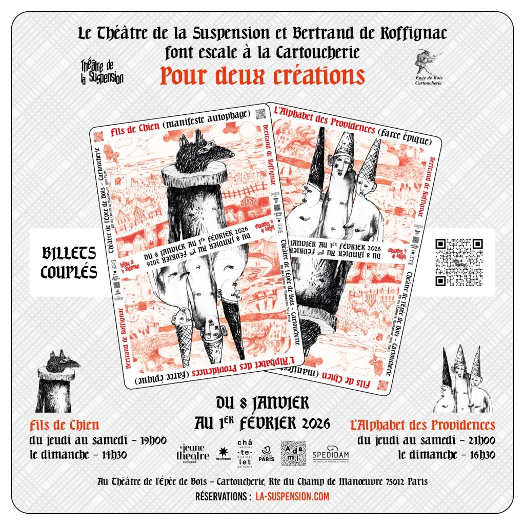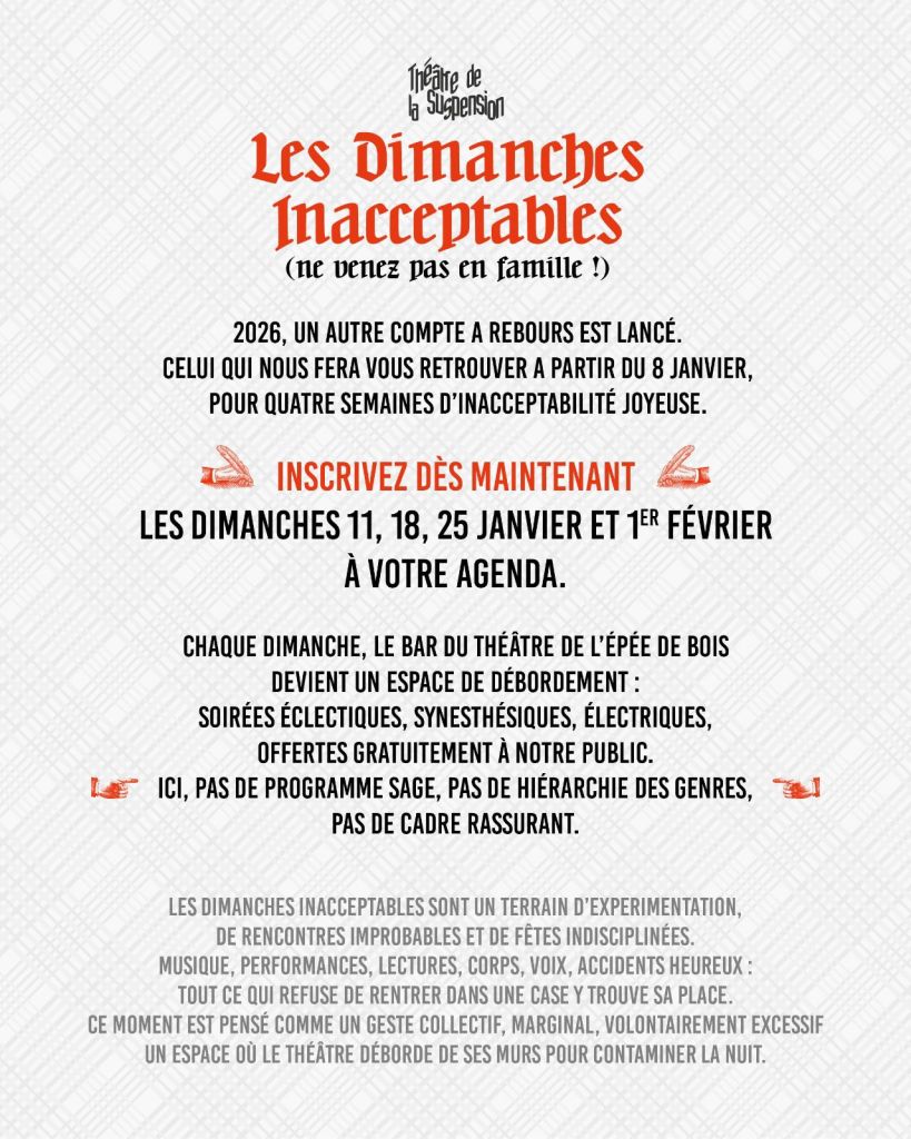 Le Théâtre de la Suspension présentera deux pièces en coréalisation avec le Théâtre de l’épée de Bois – Route du Champs Manœuvre 75012 Paris :