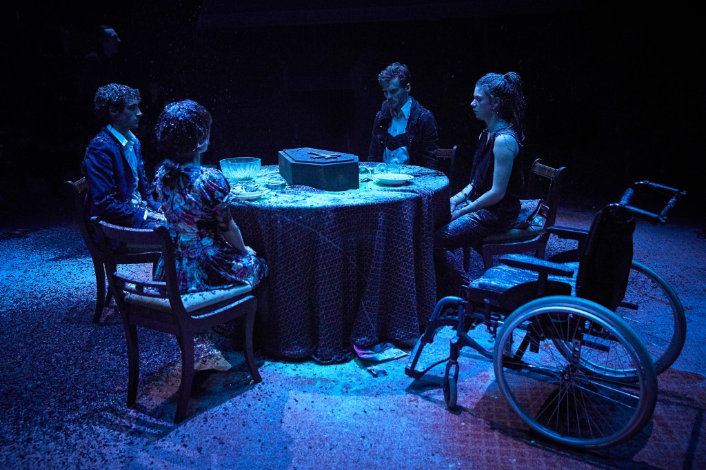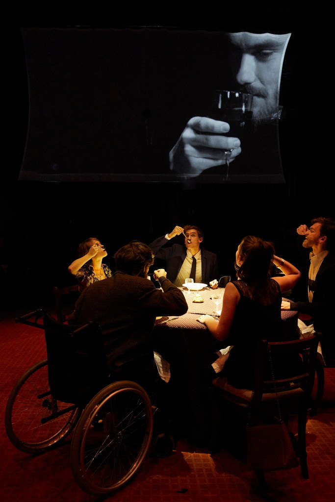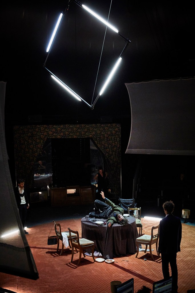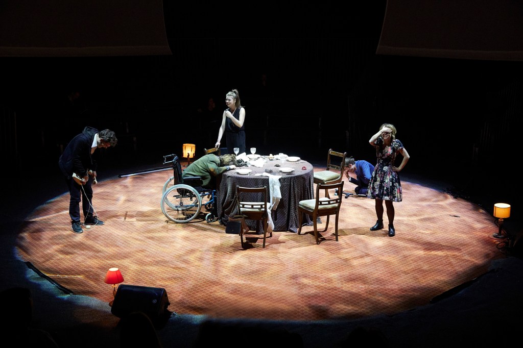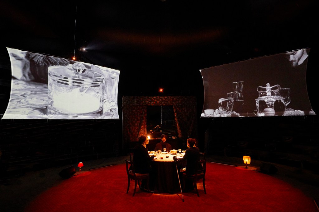 Tout le dispositif scénique est pensé pour favoriser la magie du trucage et l’immersion cinématographique. Au milieu, un plateau rond, isolé de toute coulisse, où ne se trouvent qu’une table à manger et cinq chaises. Autour de cette piste circulaire centrale, quatre gradins dessinent les faces d’un carré dont seul un coin est occupé – c’est là que se trouve le kiosque de la musique où joue tout au long de la pièce un groupe live (guitare, batterie, clavier). Au-dessus de chaque gradin, des écrans panoramiques sont tendus : quatre surfaces de projection qui entourent les spectateurs. Quatre points focaux, pour proposer une expérience à la fois charnelle, numérique et multipolaire.