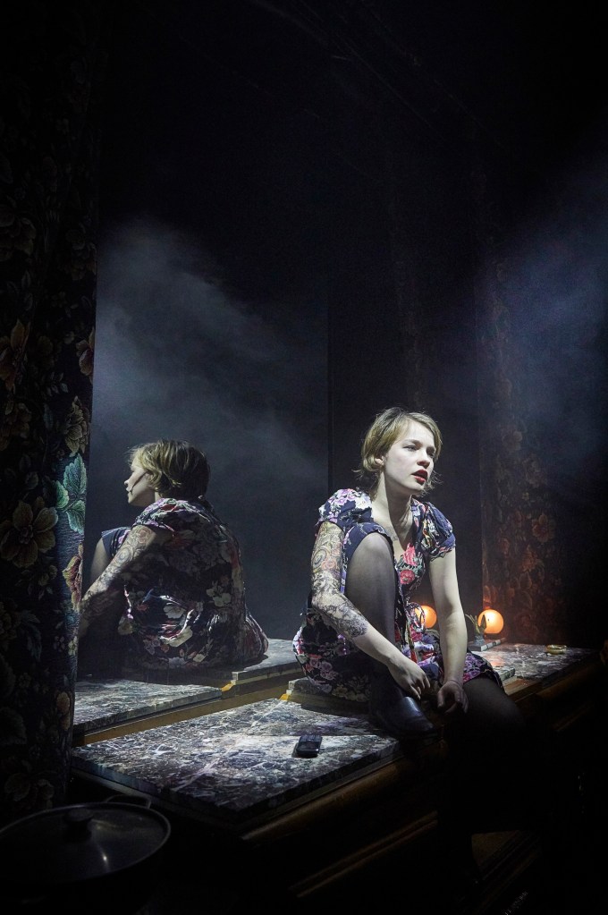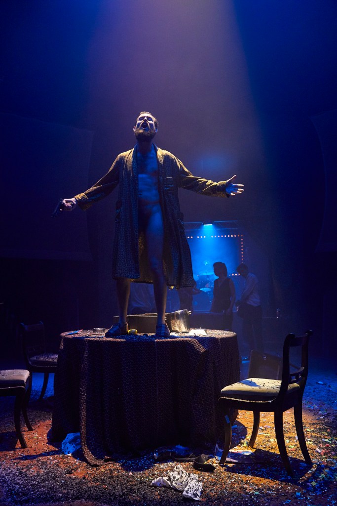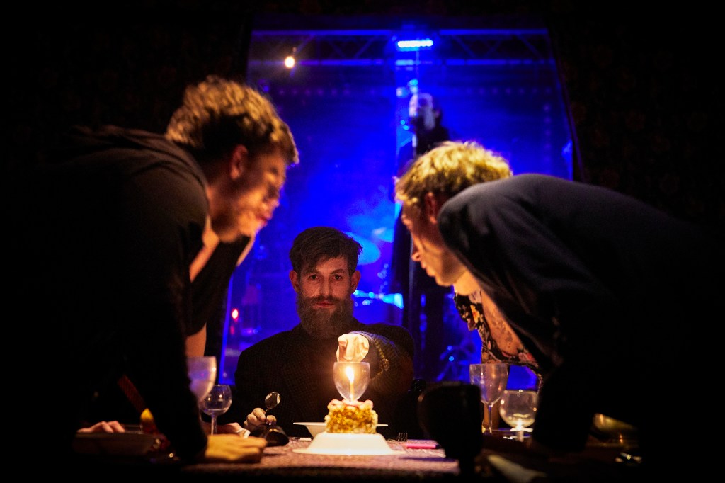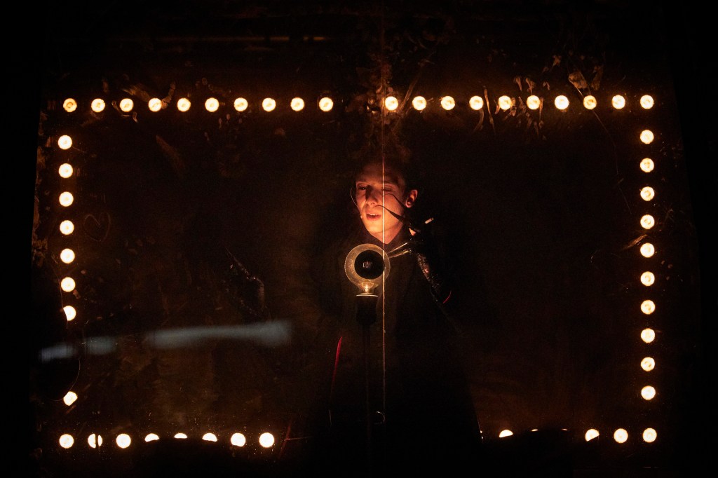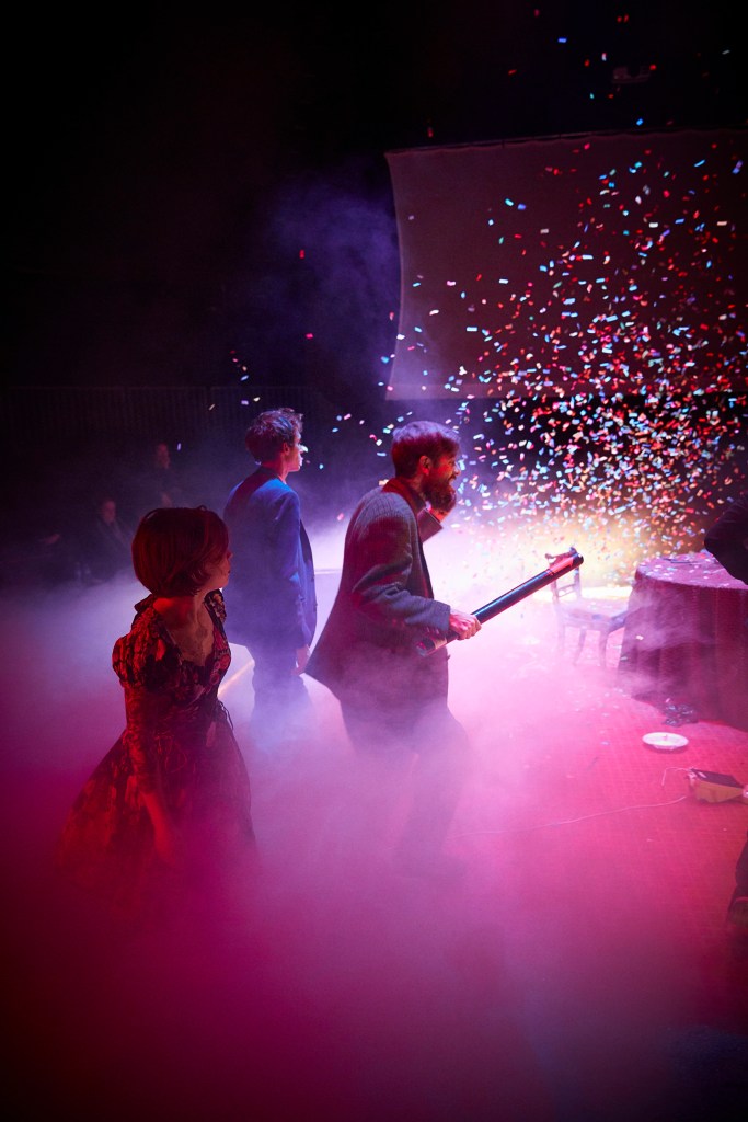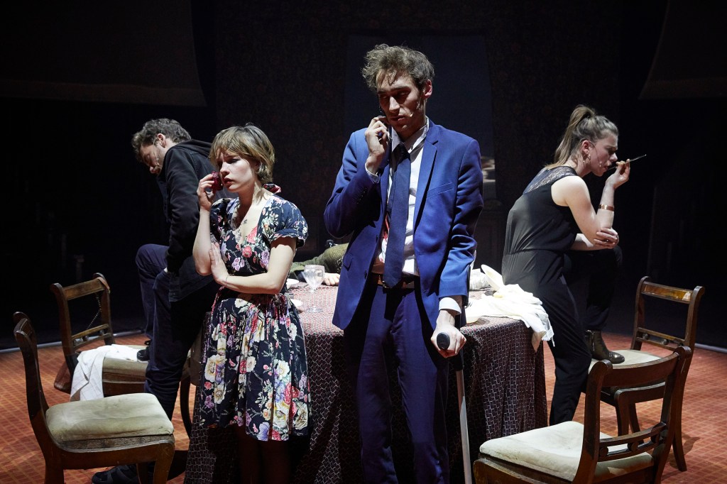 Tout le dispositif scénique est pensé pour favoriser la magie du trucage et l’immersion cinématographique. Au milieu, un plateau rond, isolé de toute coulisse, où ne se trouvent qu’une table à manger et cinq chaises. Autour de cette piste circulaire centrale, quatre gradins dessinent les faces d’un carré dont seul un coin est occupé – c’est là que se trouve le kiosque de la musique où joue tout au long de la pièce un groupe live (guitare, batterie, clavier). Au-dessus de chaque gradin, des écrans panoramiques sont tendus : quatre surfaces de projection qui entourent les spectateurs. Quatre points focaux, pour proposer une expérience à la fois charnelle, numérique et multipolaire.